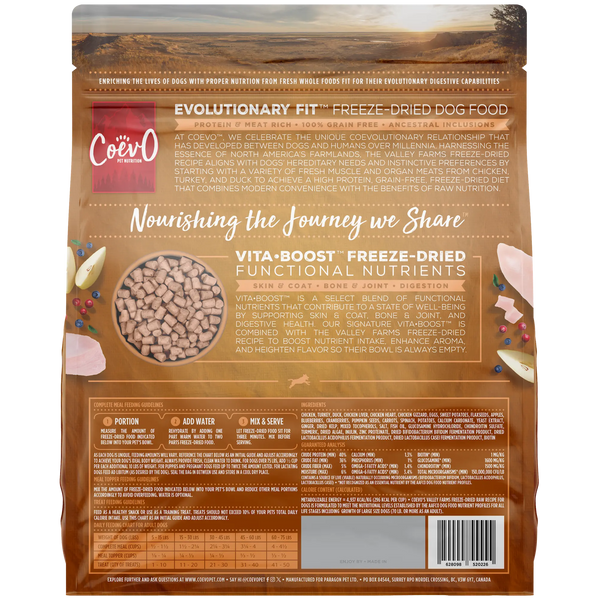 Our Evolutionary Fit™ Freeze-Dried Raw recipes use high inclusions of fresh animal ingredients and are grain free. Valley Farms starts with a variety of fresh deboned chicken, turkey, and duck, followed by ancestral inclusions, such as chicken liver and chicken heart in ancestral ratios, to add protein, flavor, and balance. Low-glycemic carbohydrates, such as apples, blueberries, cranberries, pumpkin seeds, carrots, and spinach, are added to provide natural sources of vitamins, minerals, and antioxidants.