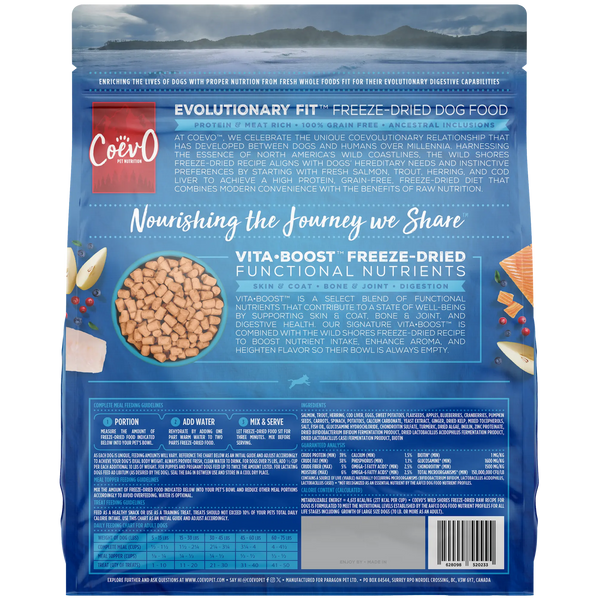 We add our signature Vita•Boost™ to our Evolutionary Fit™ Wild Shores Freeze-Dried Raw recipe, which consists of fresh deboned fish, cod liver, fruits, and other delicious ingredients, to boost nutrient intake, enhance aroma, and increase flavor so the bowl is always empty. Vita•Boost™ is a select blend of functional nutrients, such as omega-3 fatty acids, zinc, glucosamine, calcium, prebiotics, probiotics, and other health boosting nutrients that provide the nutrition dogs require to support a state of well-being against skin & coat, bone & joint, and digestive issues.
