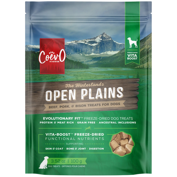 Our Evolutionary Fit™ freeze-dried treats use high inclusions of fresh animal ingredients and are grain free. Open Plains treats start with a variety of fresh deboned beef, pork, and bison, followed by ancestral inclusions, such as beef liver, beef heart, and beef tripe to add protein, flavor, and balance. Low-glycemic carbohydrates, such as apples, blueberries, and cranberries are added to provide natural sources of antioxidants and fiber.