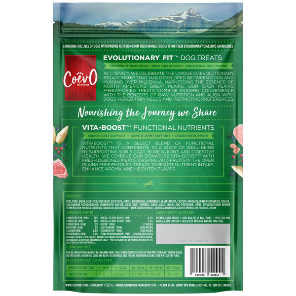 We add our signature Vita•Boost™ to our Evolutionary Fit™ Open Plains freeze-dried treats that consists of fresh deboned meats, organs, and fruits to boost nutrient intake, enhance aroma, and increase flavor. Vita•Boost™ is a select blend of functional nutrients, such as omega-3 fatty acids, zinc, glucosamine, calcium, prebiotics, probiotics, and other health boosting nutrients that provide the nutrition dogs require to support a state of well-being against skin & coat, bone & joint, and digestive issues.
