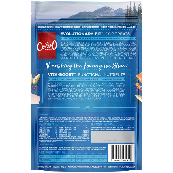 Our Evolutionary Fit™ freeze-dried treats use high inclusions of fresh animal ingredients and are grain free. Wild Shores treats start with a variety of fresh deboned salmon, trout, and herring, followed by ancestral inclusions, such as cod liver to add protein, flavor, and balance. Low-glycemic carbohydrates, such as apples, blueberries, and cranberries are added to provide natural sources of antioxidants and fiber.