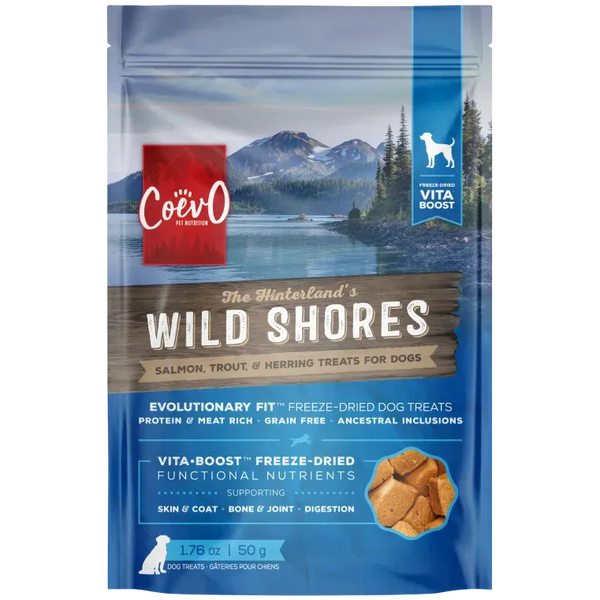 The Wild Shores Vita•Boost™ treats mirror the animal proteins that hail from the Northwest Pacific Coast. Freeze-dried raw salmon, trout, herring, and cod liver are enriched with Vita•Boost™ to provide a boost of nourishment that supports quality of life. Can be fed as a treat or topper.